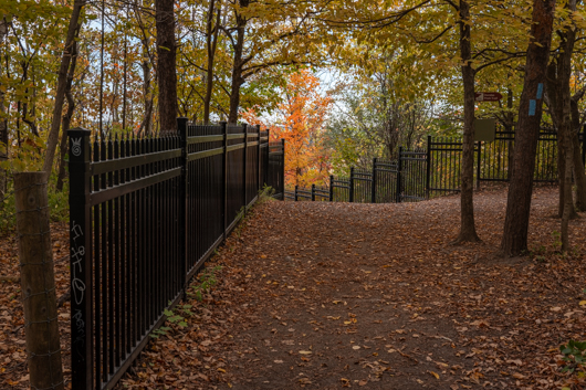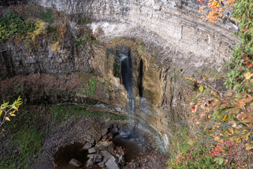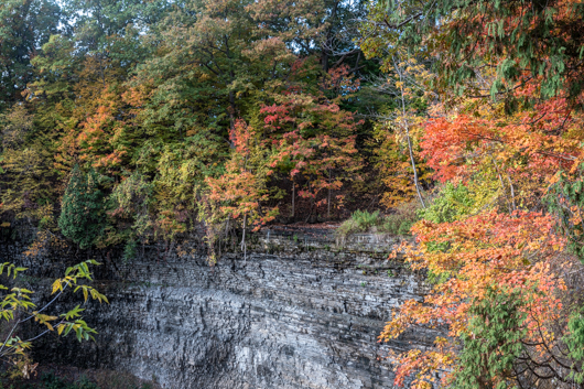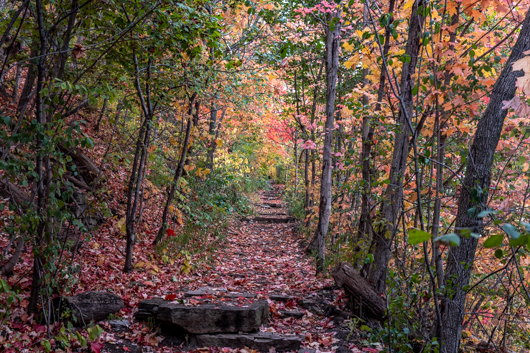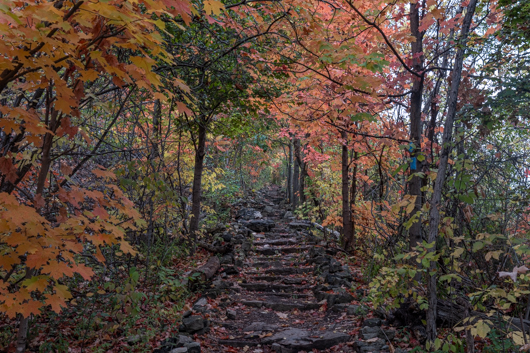 Wenn man von Osten her über den Tew Falls Side Trail kommt, geht es über eine lange Schleife hinauf aufs Escarpment. Der Aufstieg über viele Steintreppen durch die herbstlichen Farben ist schon recht magisch.
