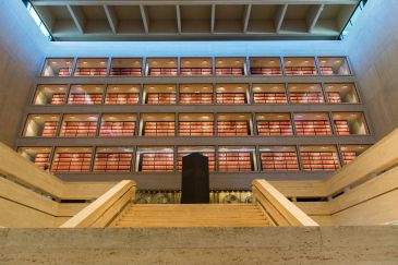 Das Museum ist in den zwei unteren und dem obersten Stockwerk des Gebäudes untergebracht. Dazwischen ist die Bibliothek, deren Inhalt durch eine eindrucksvolle Glaswand den Besuchern sichtbar ist.