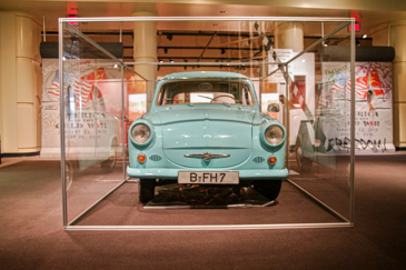 Trabbi unter Glas, und das im Herzen Michigans. Das obligatorische Stück Berliner Mauer steht im Foyer.
